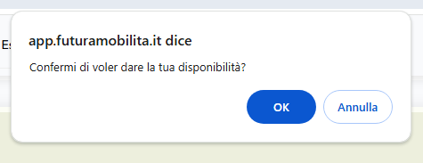 Se il servizio viene contrassegnato come “urgente” e appare arancione nella lista, il sistema non attende le 36 ore dalla pubblicazione ma lo assegna automaticamente al primo vettore che si candida. Non essendo soggetto a revoca da parte di chi si aggiudica il servizio, per inviare la propria candidatura viene chiesto di confermare la propria intenzione cliccando sul popup che comparirà all’interno del browser web.