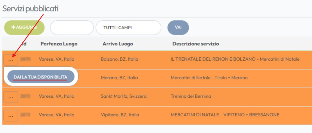 Se sulla piattaforma è presente un annuncio di servizio per il quale si è interessati, cliccare sui tre puntini e candidarsi cliccando il pulsante che compare. L’annuncio verrà contrassegnato in verde e verrà mostrato il numero di vettori che si sono candidati al servizio.