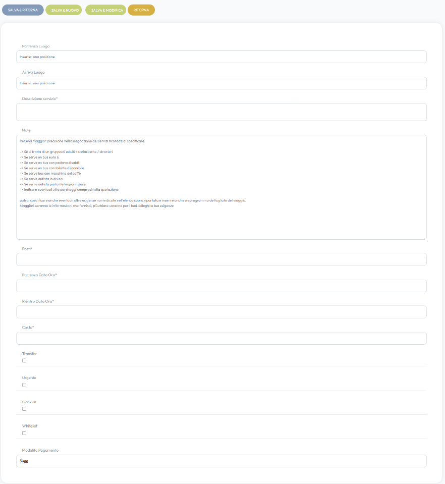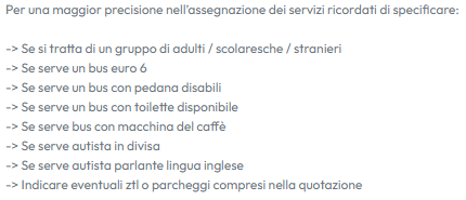 In questo campo inserire una descrizione sintetica della tipologia del servizio richiesto, ad esempio se si tratta di una gita in giornata, di un transfer per l’aeroporto ecc.